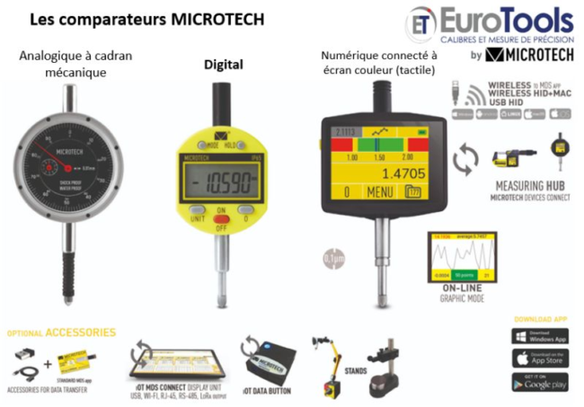Les comparateurs Microtech : mécanique, digital ou en version numérique connectée avec mémoire intégrée Les comparateurs de Microtech, c’est un large choix en version :1. Analogique à cadran mécanique : une résolution de 0,01 et 0,001 mm2. Digital (fonction PRESET) : une résolution de 0,01 et 0,001mm3. Numérique connecté, multifonctionnel et informatisé avec transfert des…