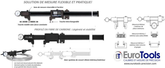Vérificateur universel de mesure comparative Ce vérificateur universel de mesure comparative possède un profilé en fibre de carbone, un comparateur à cadran mécanique, un afficheur digital coulissant avec serrage ainsi qu’un ressort de force de mesure intégrés pour une mesure constante.Le profilé en fibre de carbone est léger et permet une meilleure stabilité dans le…